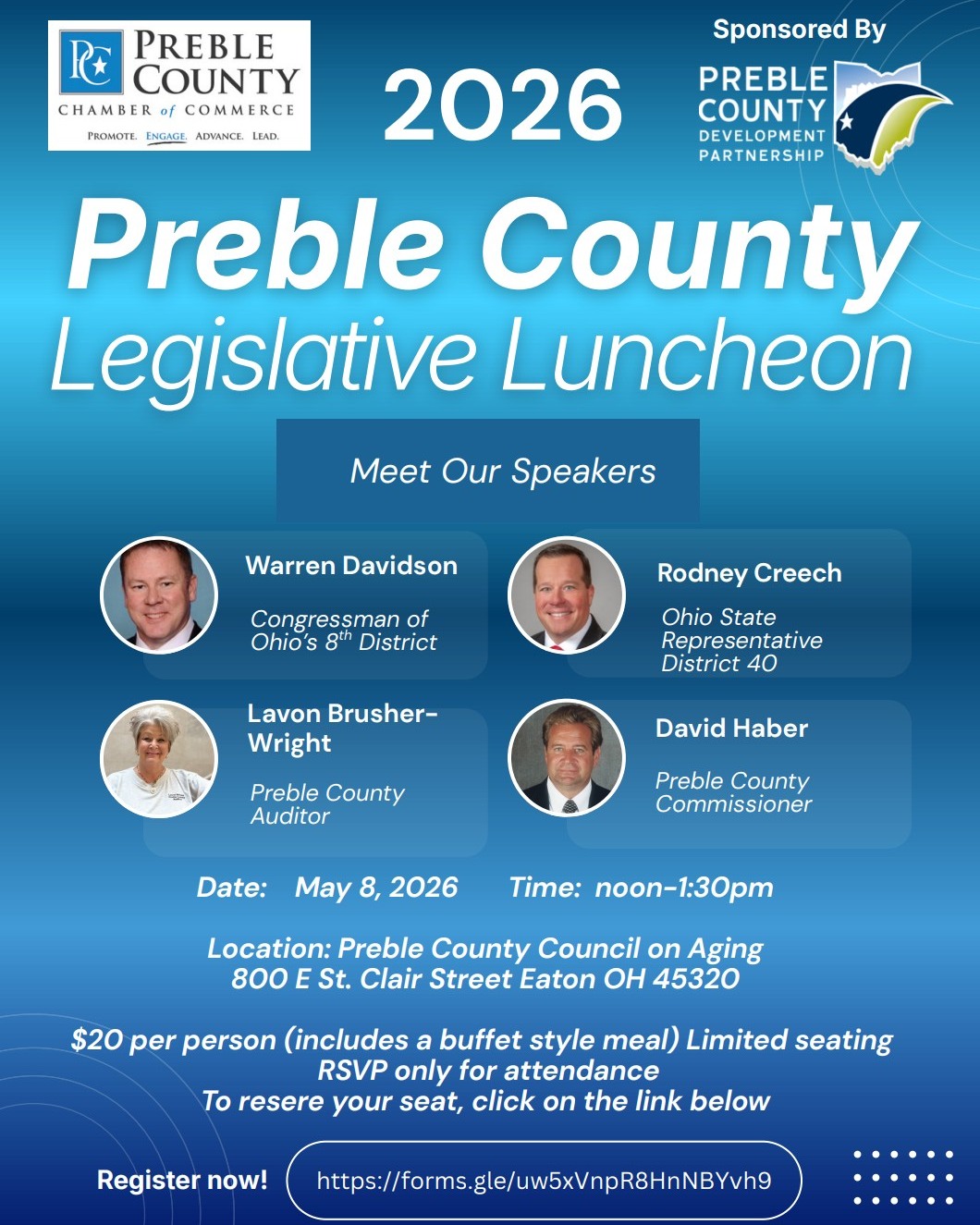 2026 Preble County Legislative Luncheon Join the Preble County Chamber of Commerce for an engaging and informative Legislative Luncheon featuring: Congressman Warren Davidson State Representative Rodney Creech Auditor Lavon Brusher-Wright […]