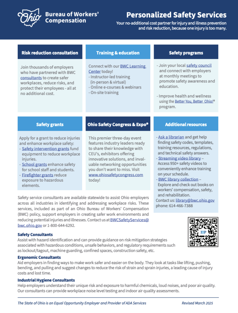 BWC: https://www.bwc.ohio.gov/employer/services/safetyhygiene.asp, groupratingsafety@bwc.state.oh.us