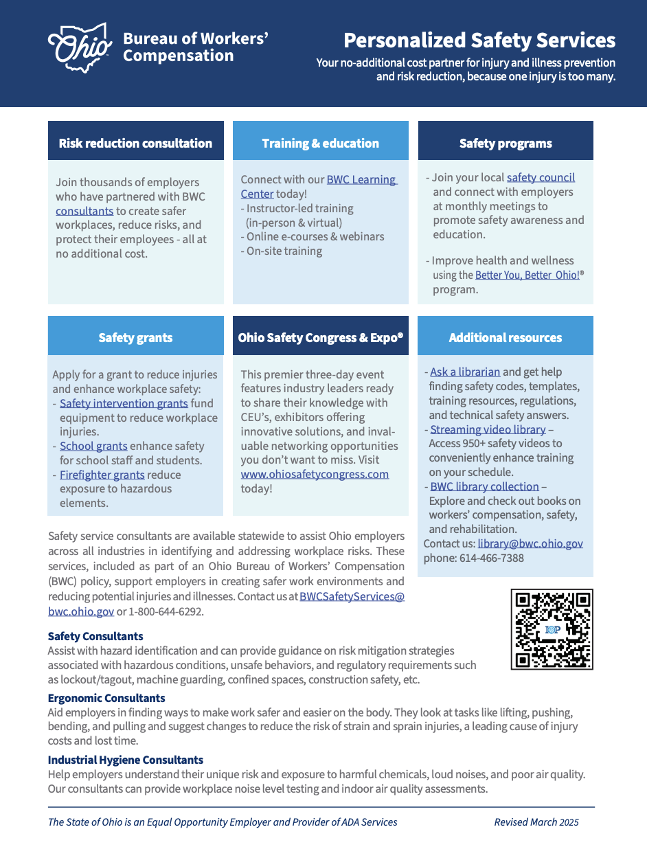- Provide safety training through Ohio’s Center for Occupational Safety & Health;